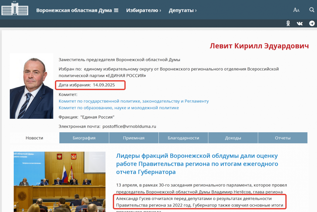 То же самое относится к информационным сообщениям на личной страничке нового депутата, вице-спикера Кирилла Левита. На его депутатской страничке новости еще от 2022 год. В том году Левит был не депутатом, а руководителем Следственного управления СКР по Воронежской области.