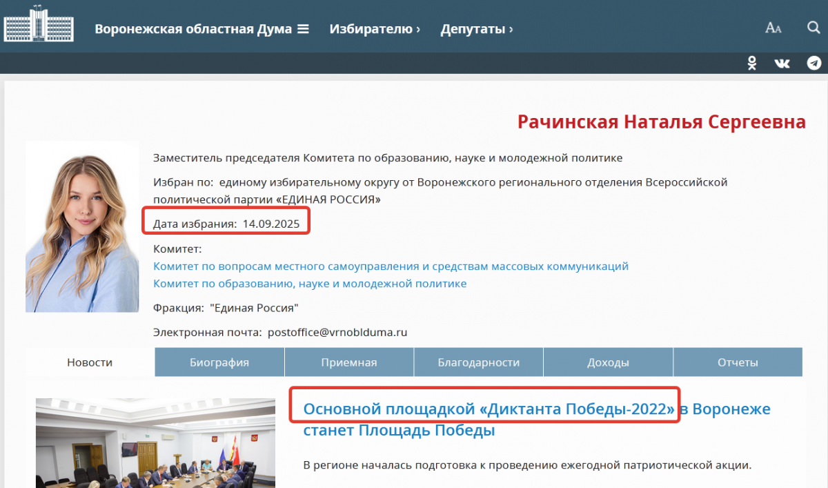 скриншот сайта облдумы, новость от 2022 года на личной странички Натальи Рачинской, которая депутатом стала через три года