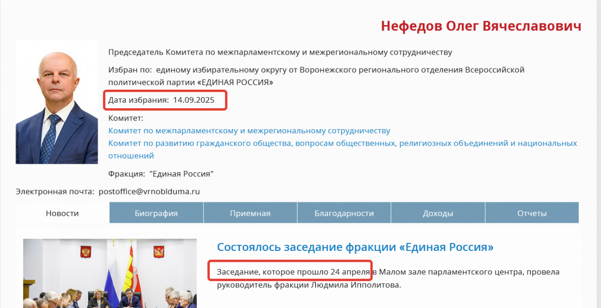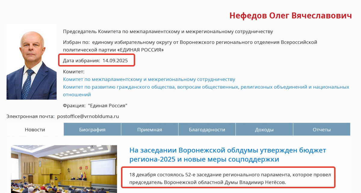 скриншот сайта облдумы, эта опубликованная информация не имеет никакого отношения к новому депутату облдумы Нефедову