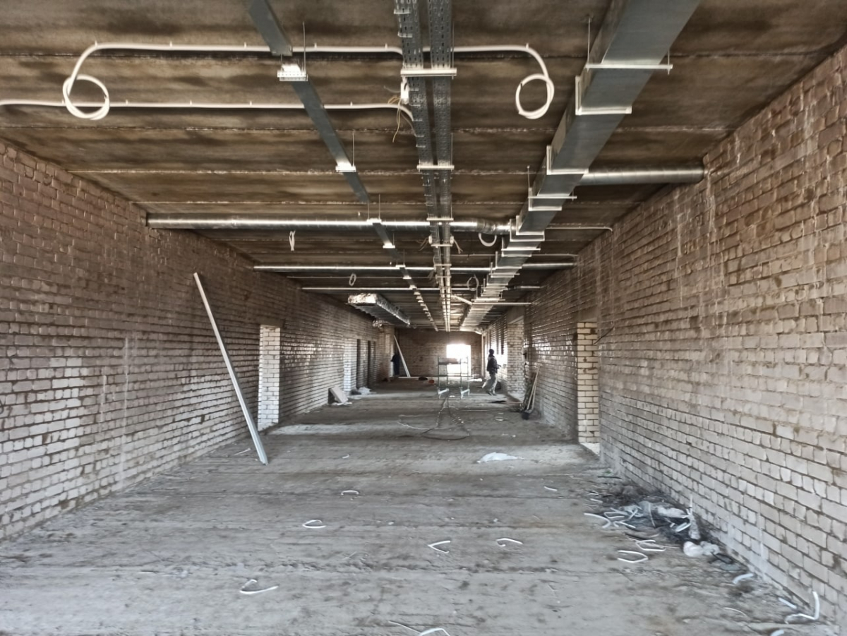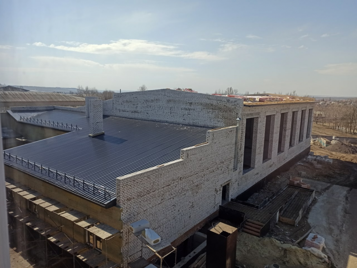 В данный момент рабочие монтируют вентиляцию и кровельное покрытие над будущим спортзалом в пристройке. Также выполняется стяжка пола и оштукатуривание стен.