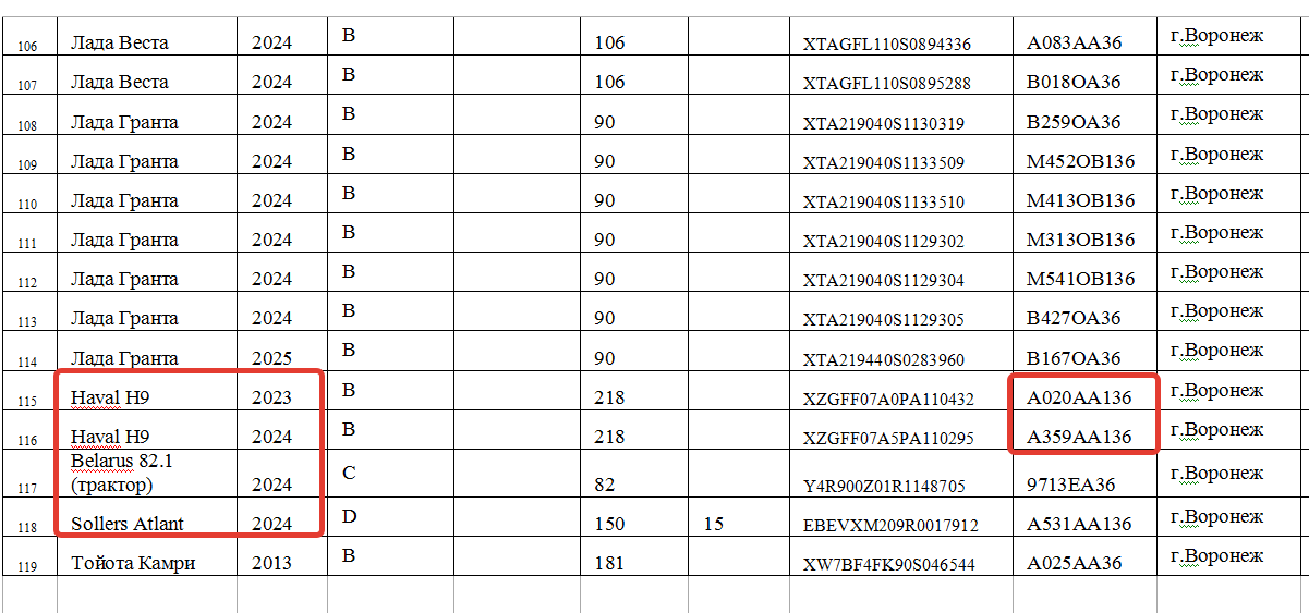 скриншот сайта госзакупок, проект муниципального контракта на оказание услуг ОСАГО для техники МКУ «Автобаза администрации городского округа город Воронеж» в 2026 году и до 1 марта 2027 года. Китайских внедорожников Haval H9, фургона Sollers Atlant и трактор Belarus 82.1 не было в прошлогоднем контракте. Стоит иметь в виду, что помимо транспортных средств из списка у городских властей могут быть еще много именно легковых машин в их различных муниципальных учреждениях, организациях, предприятиях.