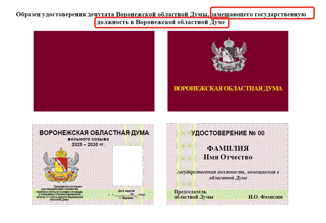 В проекте постановления сообщается, что для «народных избранников» предусмотрено два образца удостоверений. Первое – для тех депутатов, которые замещают государственную должность в Воронежской облдуме. Это председатель Юрий Матузов, два его заместителя – Александр Солодов и Кирилл Левит, а также председатели думских комитетов. Возможно, этот статус может быть дан и иным лицам, к примеру, руководителям думских фракций.