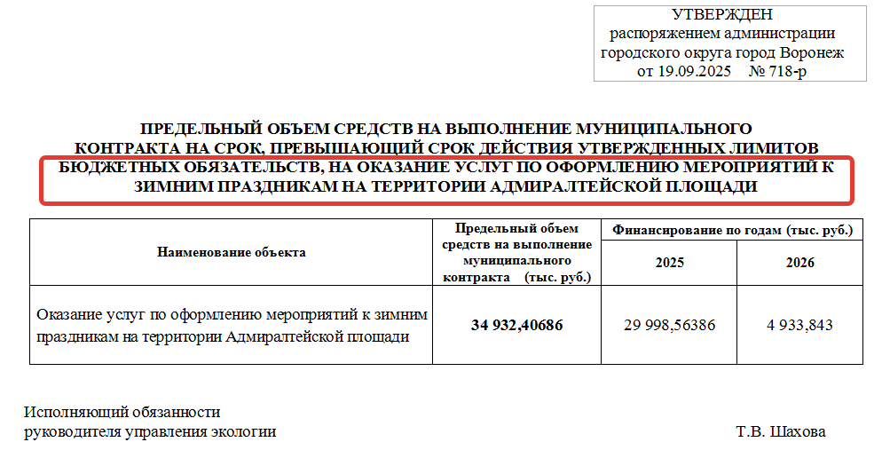 Более 82 млн рублей готов потратить мэр Воронежа Сергей Петрин на проведение и оформление мероприятий на территории Адмиралтейской площади в дни зимних праздников. В последних документах, подписанных градоначальником перед своим двухнедельным отпуском, четко прописано, на какие конкретно мероприятия планируется израсходовать десятки миллионов рублей.