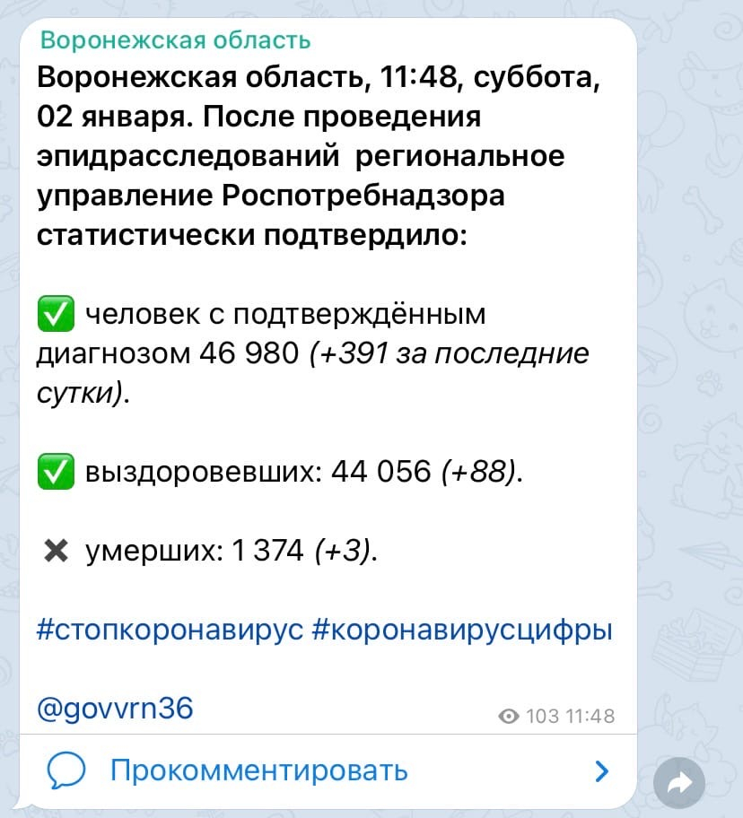 Утром 2 января оперативный штаб по борьбе с коронавирусом в Воронежской области опубликовал свежую информацию по COVID-19. Согласно ей, еще у 391 человека диагностировали опасное заболевание.