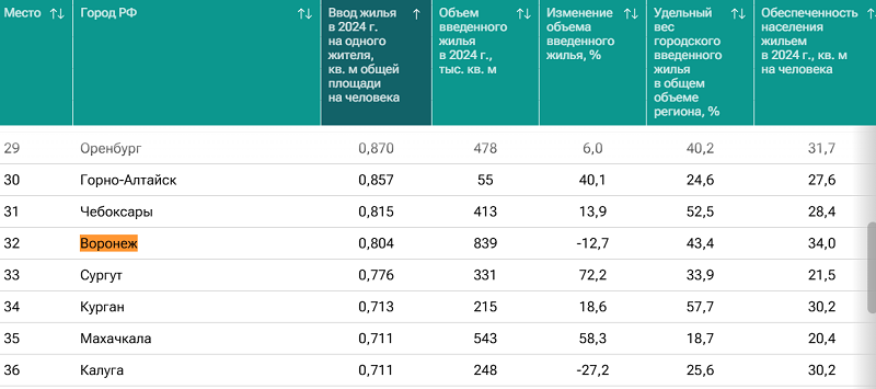 В рейтинге городов России по объемам ввода жилья за 2024 год Воронеж занял тридцать вторую строчку. За год у нас было введено 839 тысяч квадратных метров или по 0,8 «квадрата» на человека.