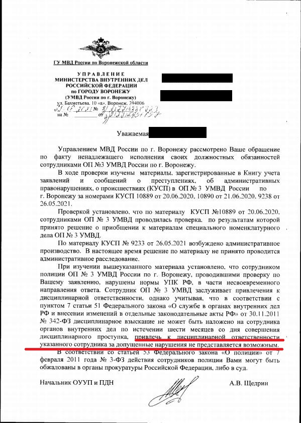 В МВД признали, что сотрудник, проводивший проверку по заявлению местных жителей, нарушил нормы УПК, дав ответ с опозданием. И он заслуживает привлечения к административной ответственности! НО! Привлекать его не будут, так как нарушение произошло более полугода назад.