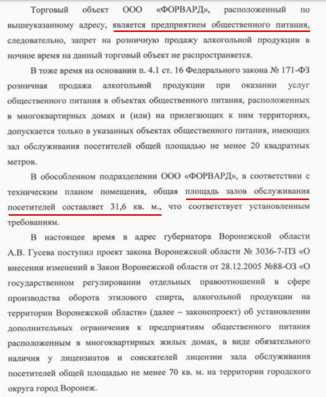 В ДИЗО в свою очередь заявили, что у ООО «Форвард» есть все необходимые лицензии на торговлю алкоголем, а площадь обслуживания посетителей составляет 31,6 квадратного метра, что якобы вписывается в рамки закона. При этом чиновники считают, что запрет на ночную продажу выпивки на «Буфетто» не распространяется, так как это точка общепита, а не обычный магазин.