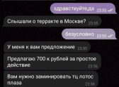 По данным полицейских, за совершение теракта обещают разные суммы. В основном около 1 млн рублей, хотя известно о случаях, когда предлагали и 250 тысяч, и 2 млн рублей. Кому-то и вовсе предлагают алкоголь или наркотики.