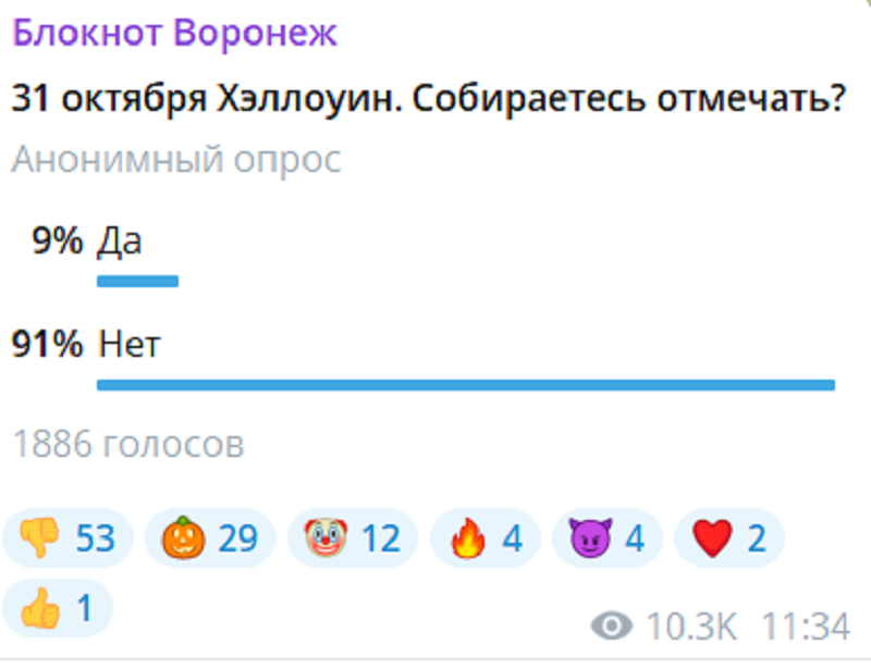 В связи с такой датой (ну и возобновлением дискуссий) мы решили провести опрос среди своих подписчиков в Telegram и посмотреть, какой процент людей у нас празднует Хэллоуин. Среди нашей аудитории 9% заявили, что намерены сегодня отмечать и 91% отказывается от празднования Дня всех святых. Всего в опросе приняло участие 1884 жителя области, то есть, празднующих из них – 168.