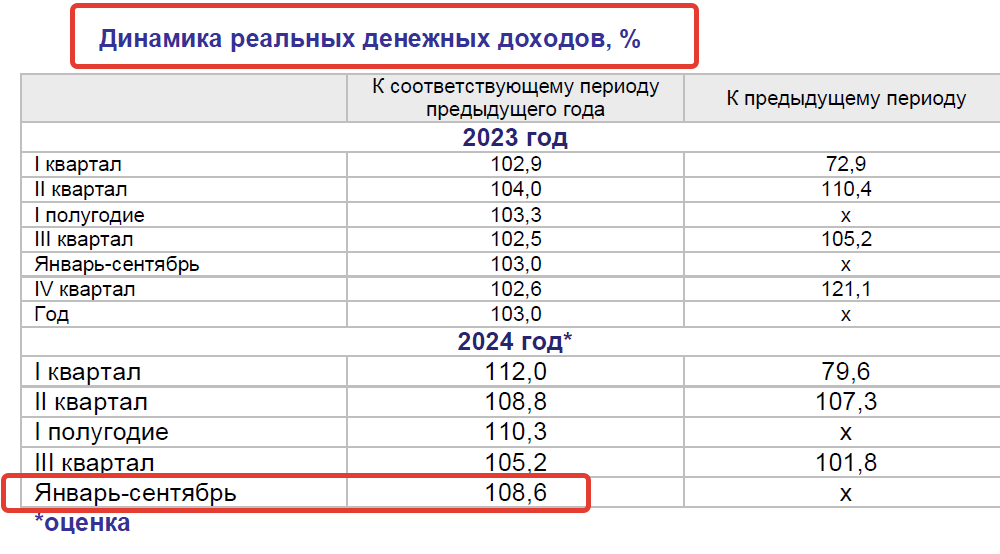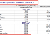 Но уже сегодня можно с уверенностью сказать, что по итогам 2024 года также будет зафиксирован рост реальных денежных доходов граждан. Такую оценку можно дать исходя их динамики процесса – ежеквартального роста показателя (за январь – сентябрь) в минувшем году.