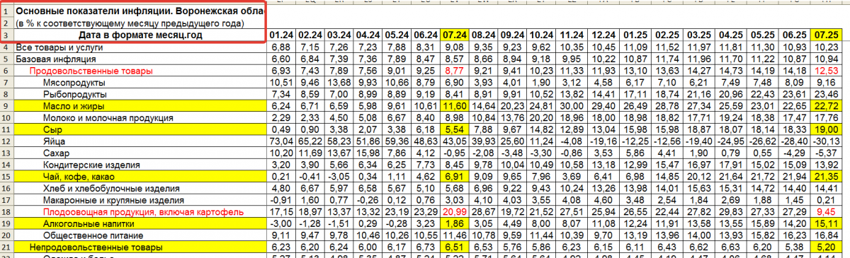 К примеру, повышение стоимости на ценниках на кофе, какао, чай, которые точно не производятся в Воронежской области, составил за 7 месяцев 2025 года 21,35%, а год назад – 6,91%. В тоже время рост цен на такие продукты, как масло и жиры, которые делают и даже экспортируют в нашей области, составил в текущем году 22,72% (больше, чем на импортный кофе). Год назад темпы роста этого показателя были в 2 раза меньше.