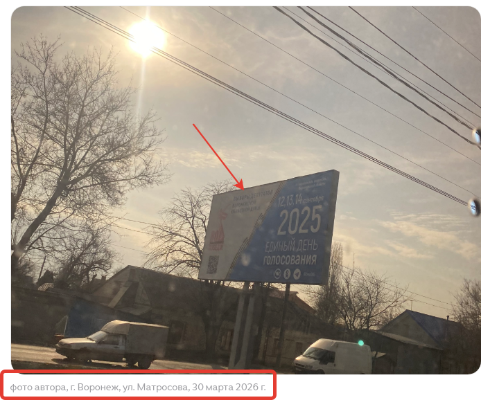 Интересно, что в Воронеже до сих пор можно увидеть рекламные щиты, вероятно от облизбиркома, на которых граждан приглашают прийти на выборы депутатов в Единый день голосования 12 по 14 сентября 2025 года.