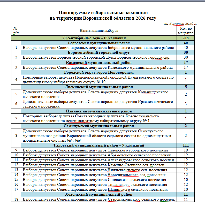 Нынешний список избирательных кампаний в Воронежской области муниципального уровня выглядит так: