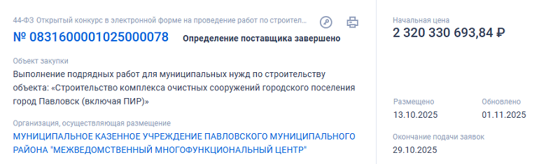 В системе госзакупок появился претендент на звание «Тендер года». 2 миллиарда 200 миллионов рублей готовятся потратить на строительство комплекса новых очистных сооружений в Павловске. Ныне действующие очистные изношены практически до крайности.