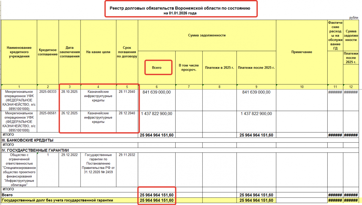 Стоит добавить, что последний раз регион получил инфраструктурные кредиты в прошлом квартале: в конце октября – 841,6 млн рублей и 26 декабря – 1 млрд 437 млн рублей. Срок их погашения – ноябрь – декабрь 2040 года, если до этого задолженность по ним не спишет федеральное казначейство. Как бы там ни было, но это будут проблемы воронежского губернатора, который будет руководить нашим регионом через 14 лет, то есть через три избирательных цикла по выборам главы Воронежской области.
