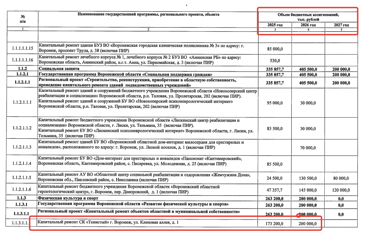 скриншот документа облправительства, на капремонт СК "Тенистый" в 2025 г. предполагалось направить 173,2 млн рублей, а в нынешнем - еще 200 млн.