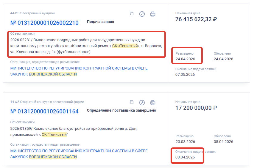 Как видно из скриншота, несколькими неделями ранее были проведены торги по комплексному благоустройству прибрежной зоны реки Дон, примыкающей к СК «Тенистый». Эта закупка за 17,2 млн рублей никого не заинтересовала. Ее заказчик, ГБУ Спортсооружение», структура минспорта, вероятно, проведет повторные торги. Но из двух последних следует, что на продолжение капремонта и благоустройства спорткомплекса «Тенистый» областные власти намерены потратить в текущем году около 100 млн рублей.