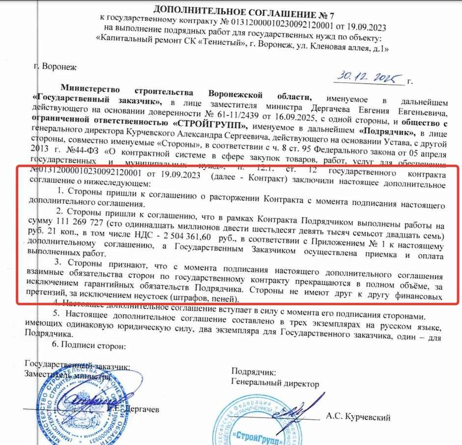 Стоит напомнить, что осенью 2023 года правительство выделяло 106,4 млн рублей на все тот же капремонт СК «Тенистый». Его сумма была увеличена до 111 млн рублей. Победителем торгов было воронежское ООО «Стройгрупп», контракт с ним минстрой расторг 30 декабря 2025 года.
