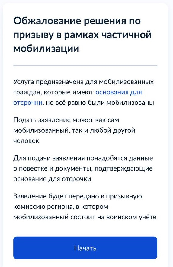 На портале Госуслуги теперь можно обжаловать частичную мобилизацию. Это могут сделать получившие повестку граждане и имеющие основания для отсрочки. При этом заявление за мобилизованного может подать другой человек.