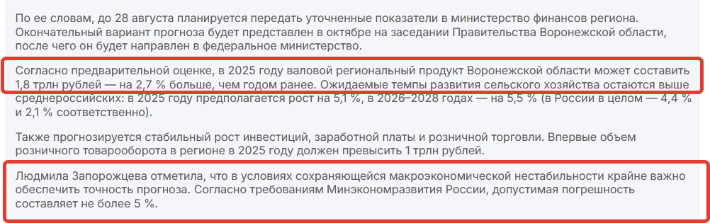 Так что эти и иные факторы не могли не сказаться на "секвестированных прогнозах" воронежских чиновников по темпам роста ВРП в 2025 и в 2026 годах. И это они «переиграли в свою пользу», заявив, словами Людмилы Запорожцевой, что «региональная экономика демонстрирует положительную динамику с темпами роста, превышающими среднероссийские».