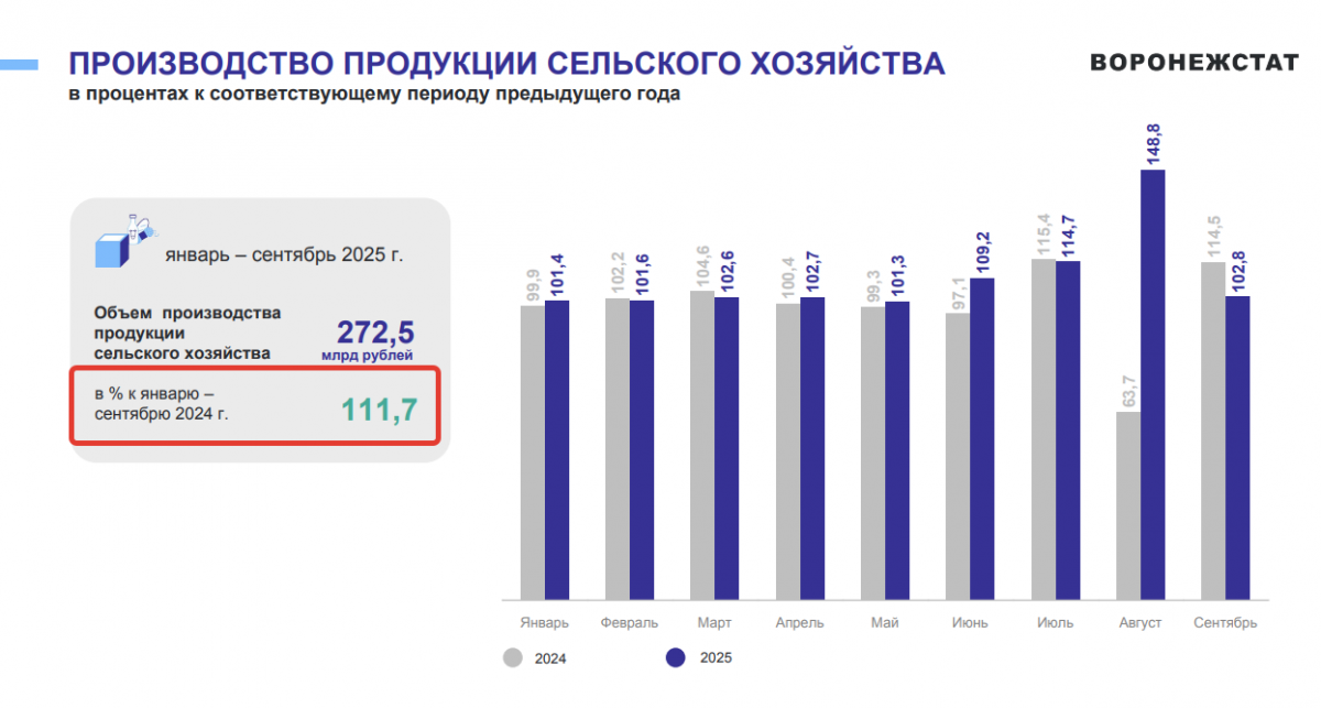 данные Воронежстата, сравниваются два разных года в АПК, неурожайный 2024-й год, и так себе (по климатическим условиям) 2025-й.