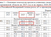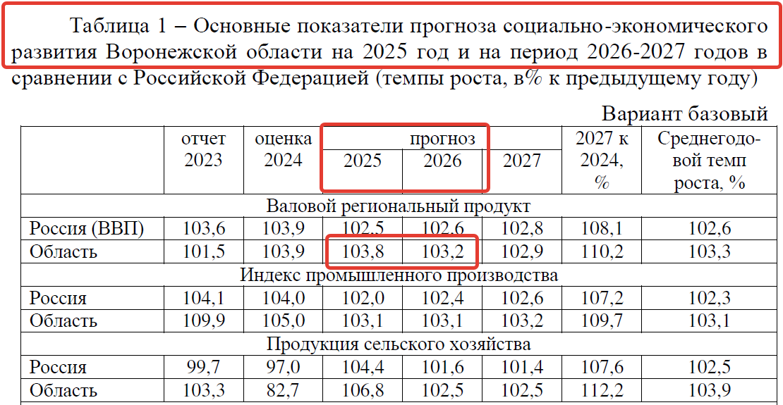 И в нем, прошлогоднем прогнозе, были такие цифры по росту валового регионального продукта (ВРП): на 2025 год – 103,8%, на 2026 год – 103,2%.