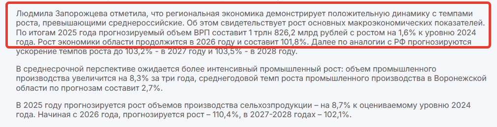 По ее словам, «региональная экономика демонстрирует положительную динамику с темпами роста, превышающими среднероссийские». Стоит сказать, что "Прогноз социально-экономического развития Воронежской области на 2026 год и плановый период 2027 и 2028 годов" официально еще не опубликован, хотя год назад аналогичный документ, подписанный губернатором, появился в открытом доступе 23 октября.