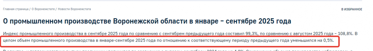 данные Воронежстата, индекс промышленного производства носит "отрицательный рост", - минус 0,5% по итогам января - сентября 2025 года по сравнению с аналогичным периодом прошлого года