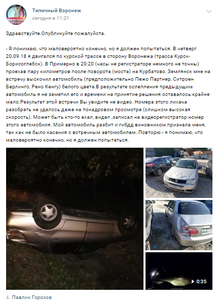 Местный житель Павел обратился к воронежцам с просьбой найти свидетелей дорожно-транспортного происшествия, которое произошло 20 сентября около 20:20 на трассе «Курск-Борисоглебск».