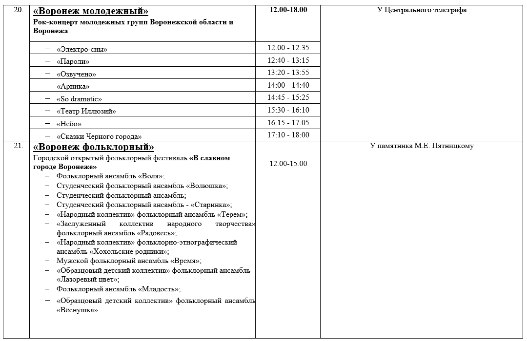 У Центрального телеграфа на проспекте Революции будет звучать тяжелая музыка. В рамках концерта «Воронеж молодежный» там с 12 до 18 часов выступят рок-группы. А у памятника Пятницкому запланирован «Воронеж фольклорный».
