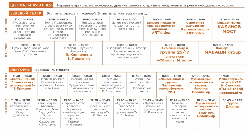 14 и 15 сентября в воронежском Центральном парке с 10:00 до 20:00 пройдет грандиозный мультижанровый семейный фестиваль, все мероприятия которого будут абсолютно бесплатными. Главным инициатором масштабного праздника является российский писатель и общественный деятель Захар Прилепин.