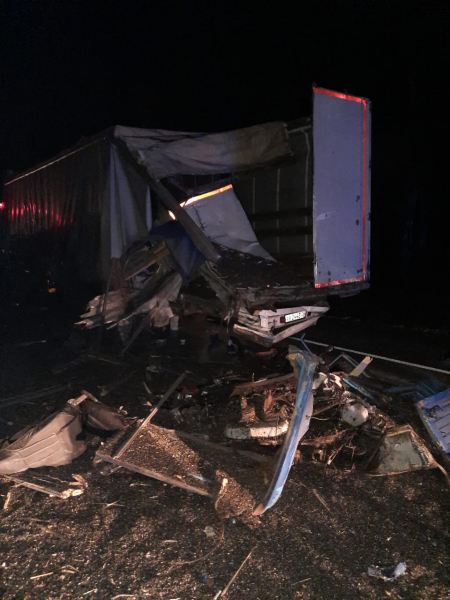 Полицейские опубликовали фото с места смертельного столкновения. Видно, что в результате ДТП иномарка оказалась вся смята. Возможно, ее зажало между грузовиками. У фуры разбит прицеп.