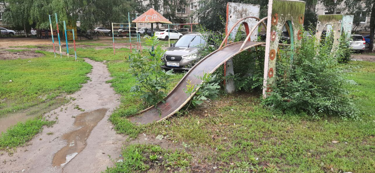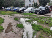 На фото, присланных в редакцию, видно, что двор представляет собой грязевое месиво, посреди которого «красуется» видавшая виды детская площадка. Свой вклад вносят и автомобилисты, паркующиеся на газонах. Вернее, на том, что должно быть газонами.