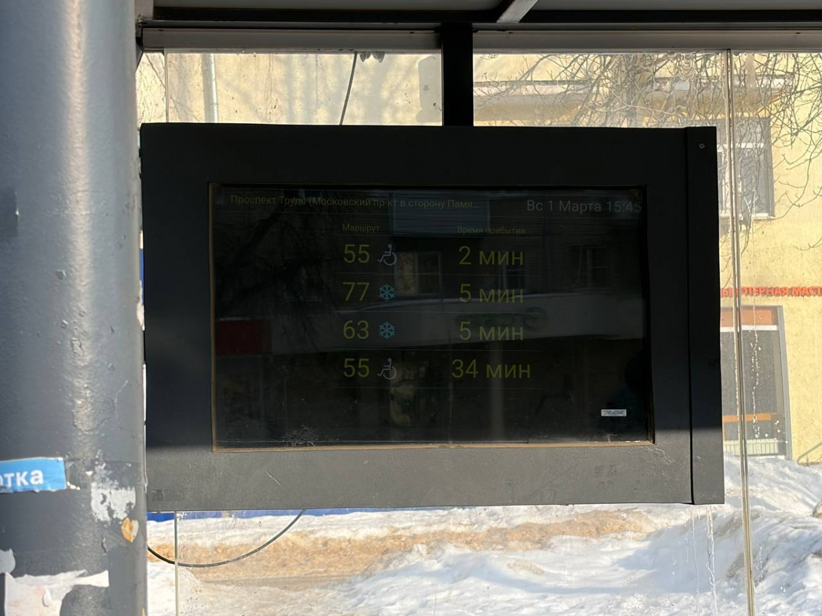Интересно, что даже когда табло работает, информация иногда обновляется с задержками или вместо расписания крутят рекламу, как, например, на остановке «Первомайский сад». А на «Театре кукол» табло не работало уже в 2024 году.