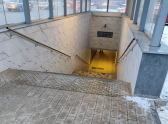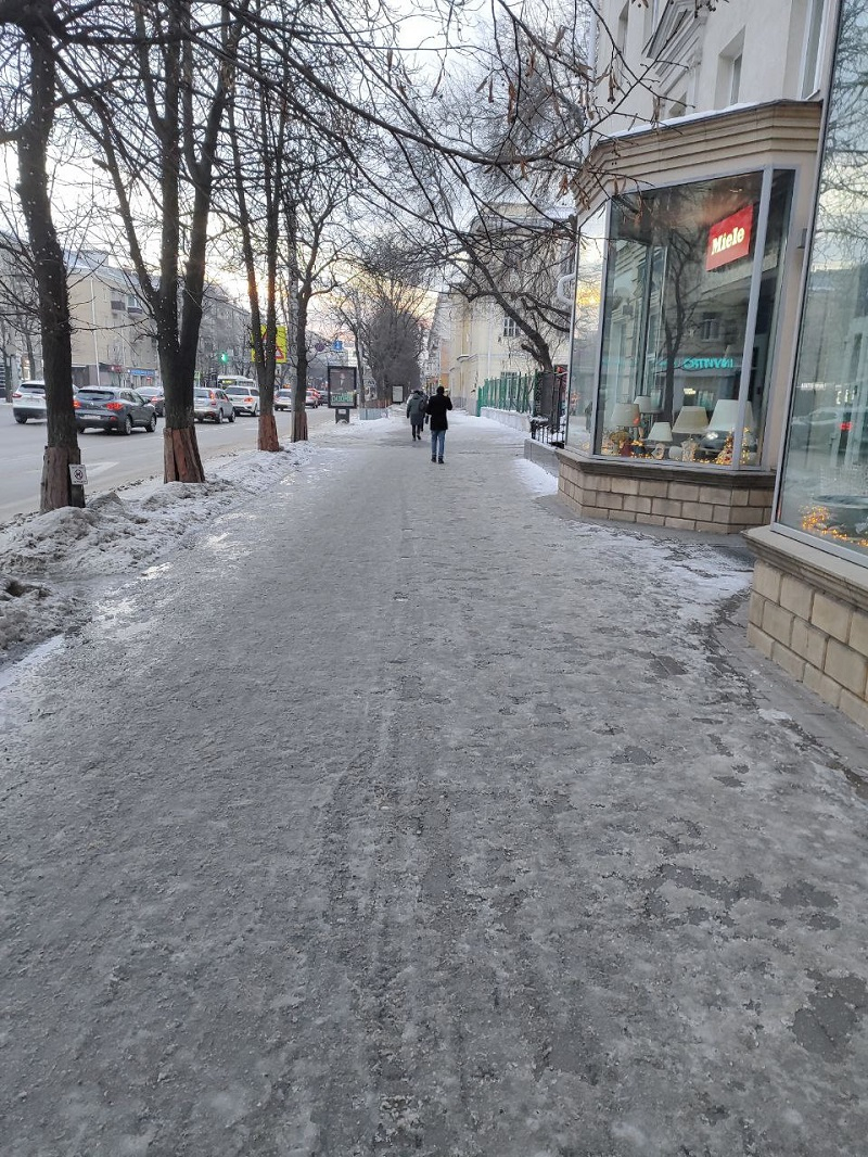 Особенно скользко у спуска в подземный пешеходник. Выглядит безобидно, но это идеально полированная ледяная поверхность.