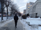 Это пирамидка у Памятника Славы, ее окрестности и остановка. Все укатано в лед, посыпки на момент съемки нет. В этой зоне передвижение на коньках видится даже не шуткой, а реальной возможностью – почему нет?