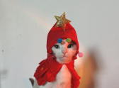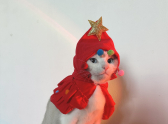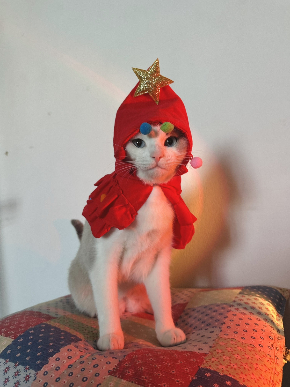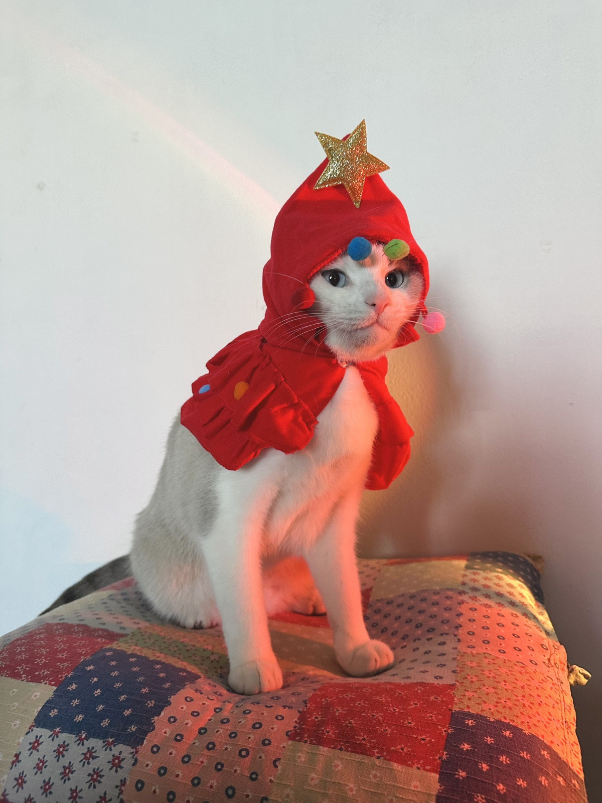 А потом — бах! — и праздничное перевоплощение: костюм «Новогодняя ёлочка». Красная накидка с капюшоном, украшенным звёздой и бубенцами. Глядя на Пряника в этом виде, хочется включить гирлянду и поставить тарелку оливье.