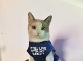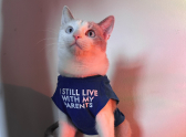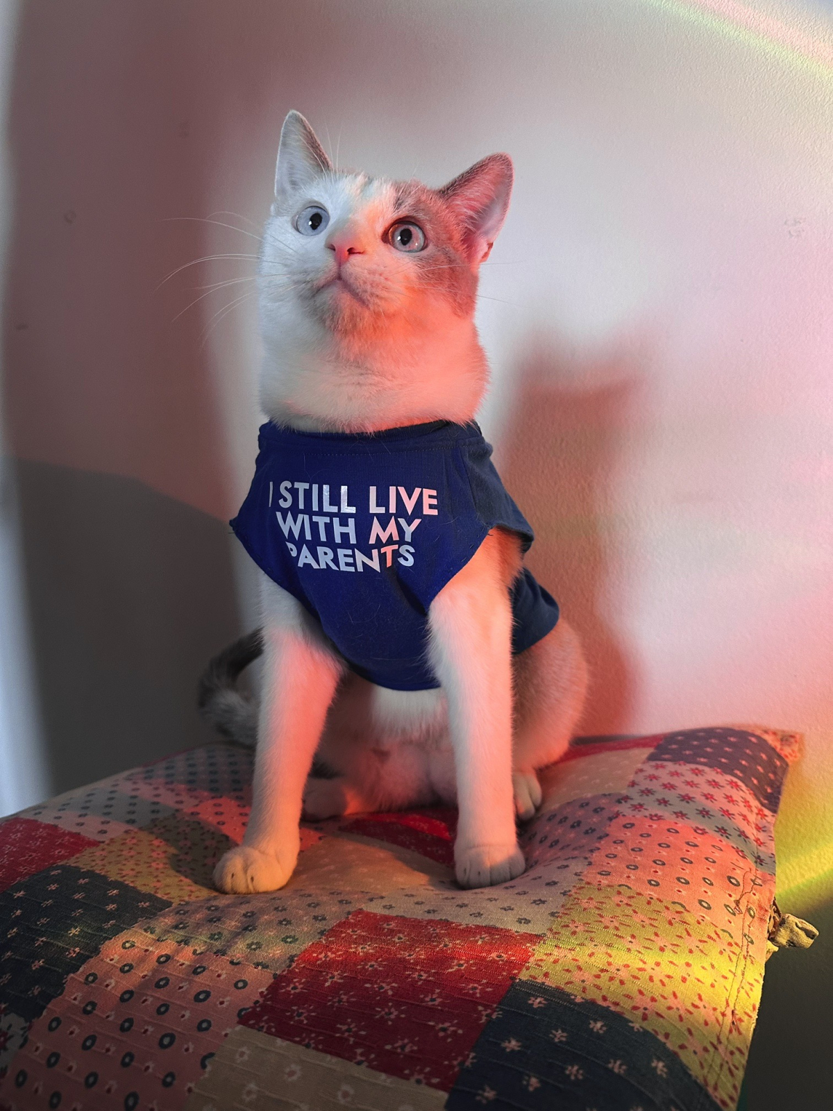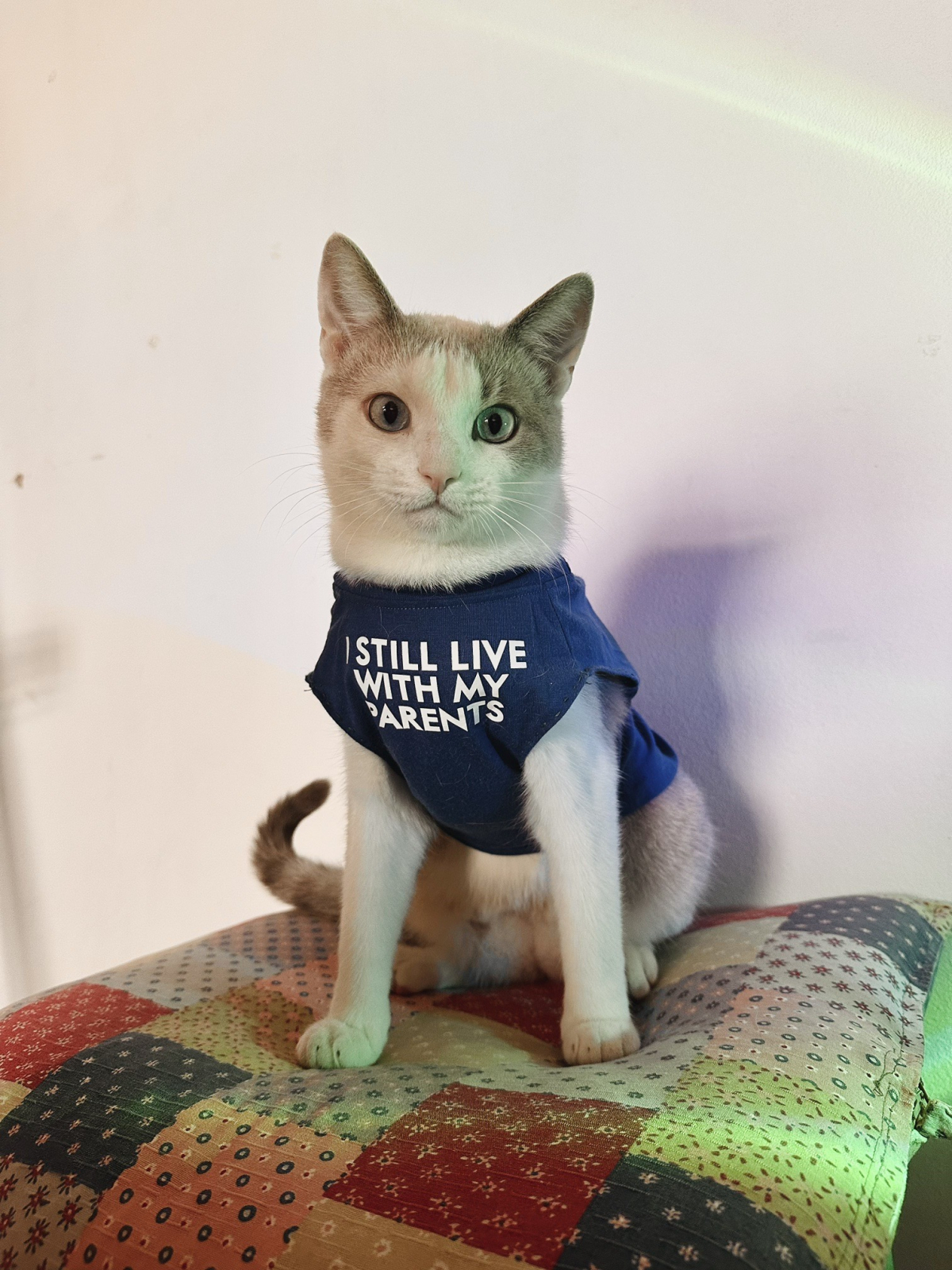 Первый выход — в синей майке с надписью «Я всё ещё живу со своими родителями». Самоирония? Безусловно. Да и что поделать — квартирный вопрос всё ещё нерешён даже у котов.