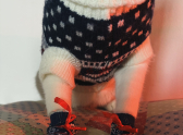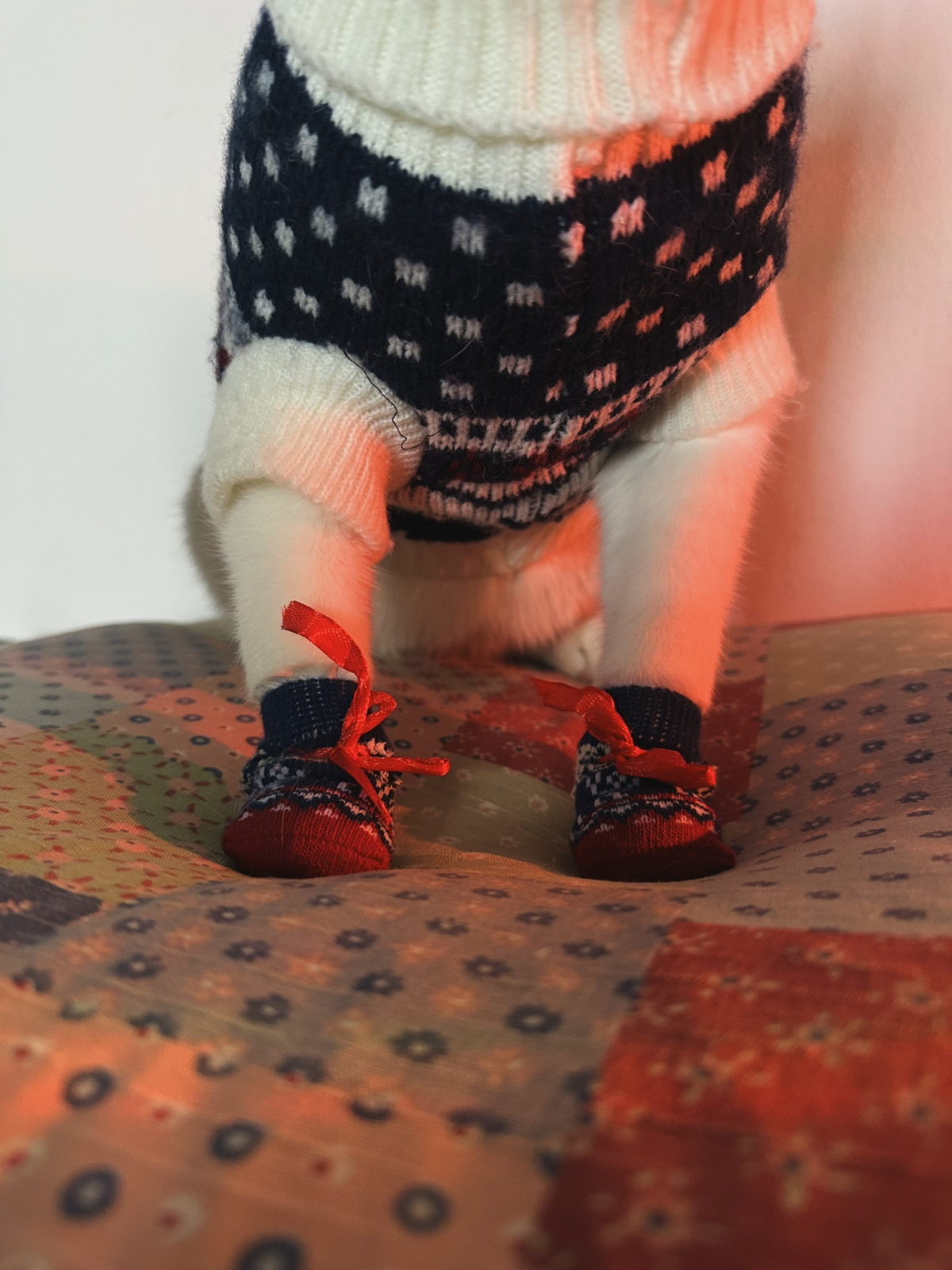 Далее — уютный зимний сет: вязаный свитерок и носочки с бантиками. В таком наряде Пряник явно готов встречать первый снег у батареи, попивая тёплое молоко.