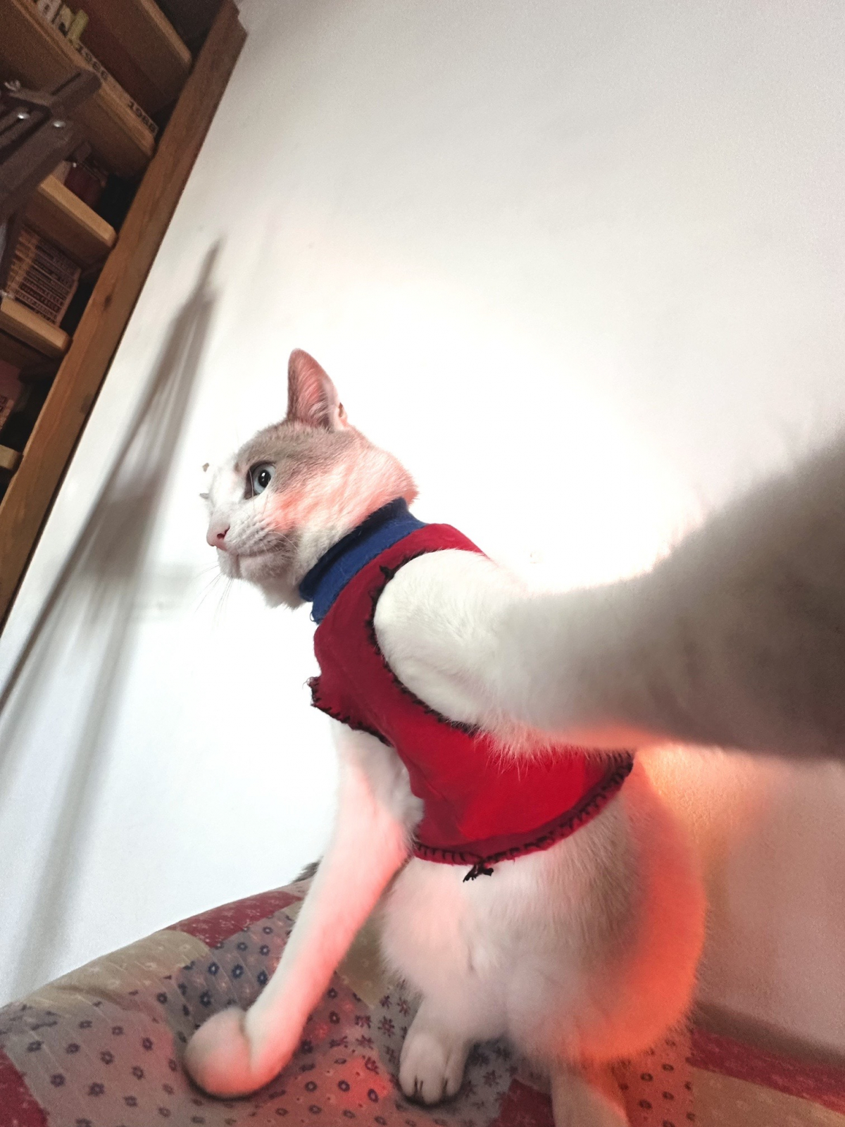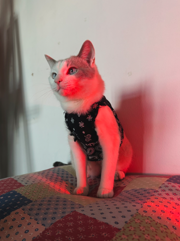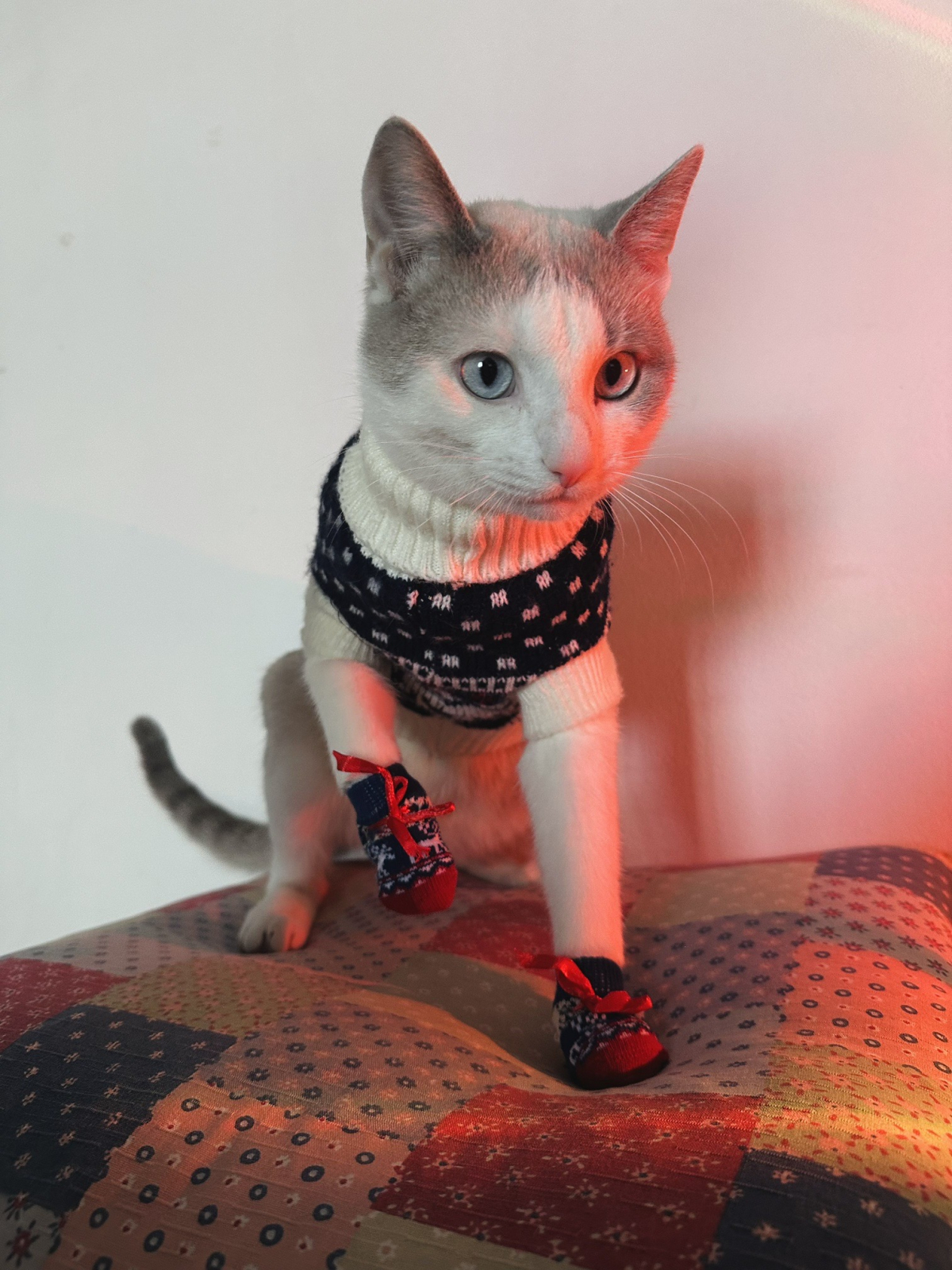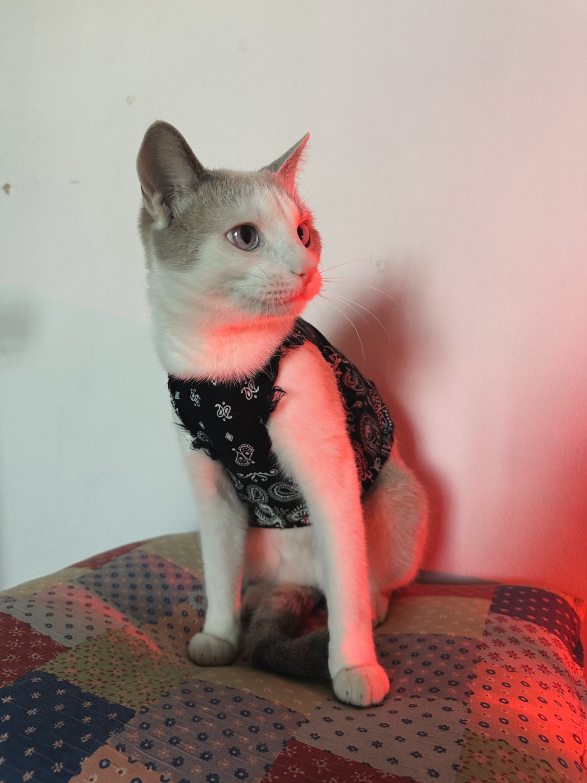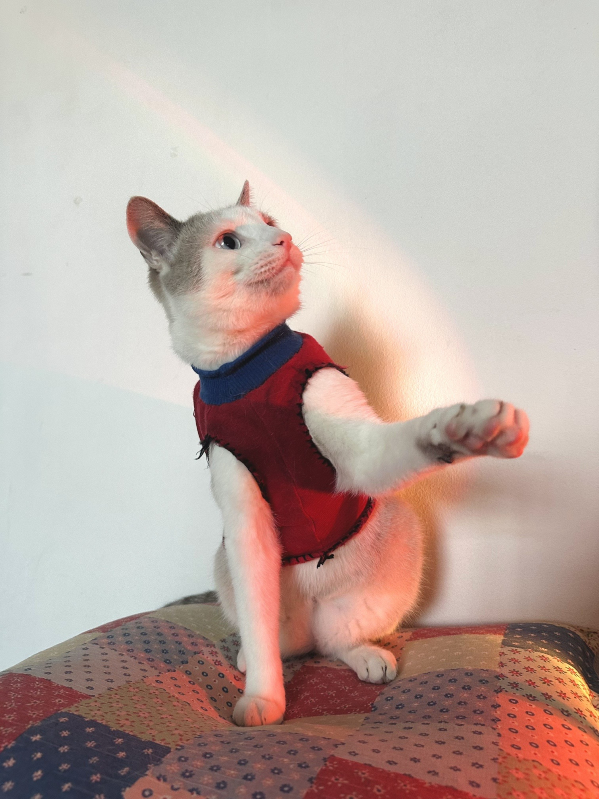 И, наконец, финал. Домашний, расслабленный образ — без лишнего гламура. Кот отворачивается от камеры, будто говорит: «Всё, на сегодня хватит. Модный приговор окончен».