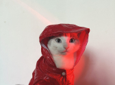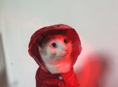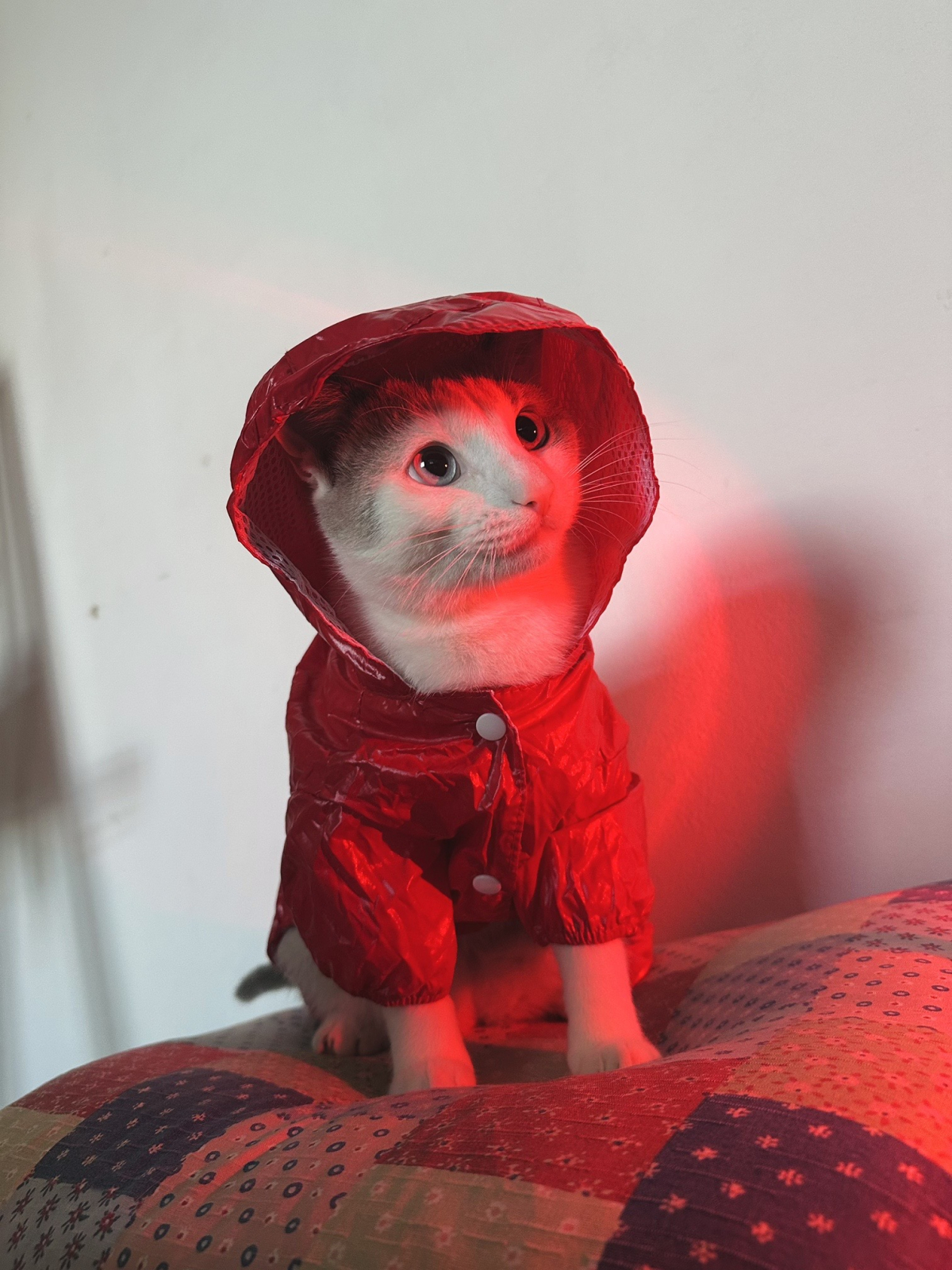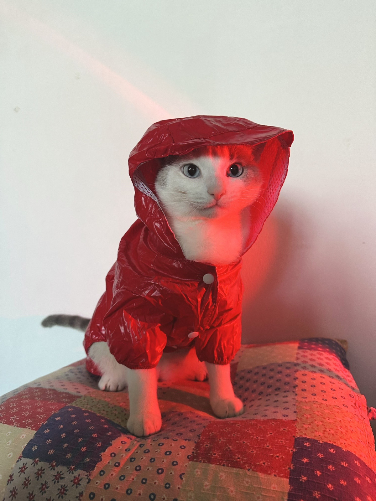 Шестой комплект — практичный: красный дождевик с капюшоном. Судя по выражению мордочки, Пряник не фанат сырой погоды, но ради фото — потерпит.