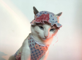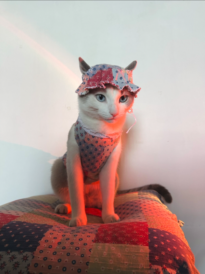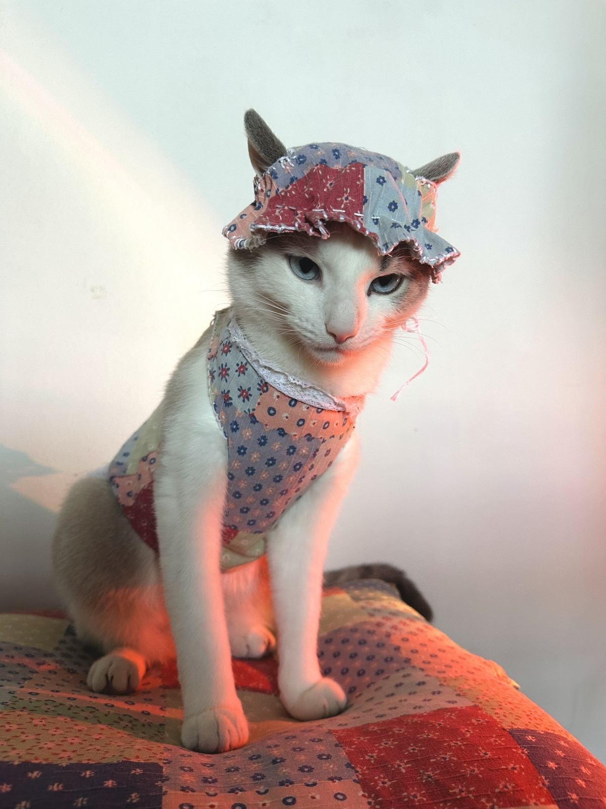 Второй образ — настоящий прованс! Кофточка с рюшами и панамка превращают Пряника в сельскую пастушку, которая вот-вот пойдёт выгуливать своих овечек. Или, как минимум, соседских котят.