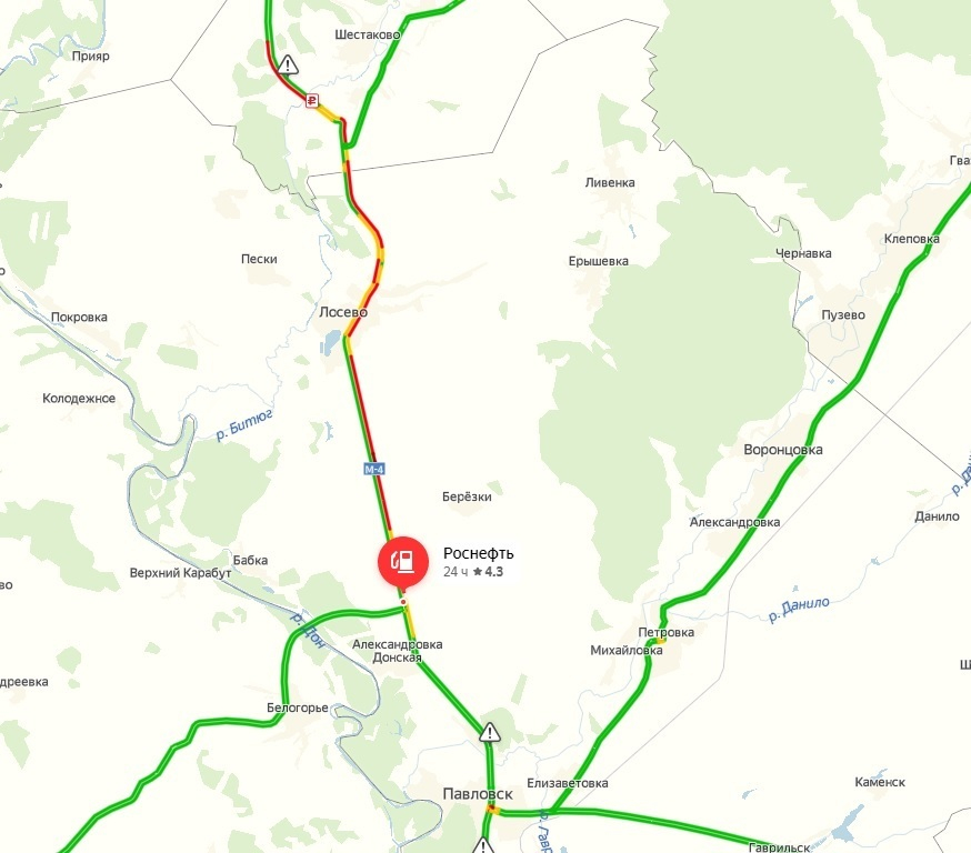 Примечательно, что встречное движение осложнено еще сильнее. Так, по данным сервиса «Яндекс.Карты», пробка со стороны Ростова-на-Дону в направлении Воронежа начинается на 659-м километре трассы М-4 «Дон», где расположены заправка «Роснефть» и поворот на Белогорье. Затор растягивается почти на 30 километров.