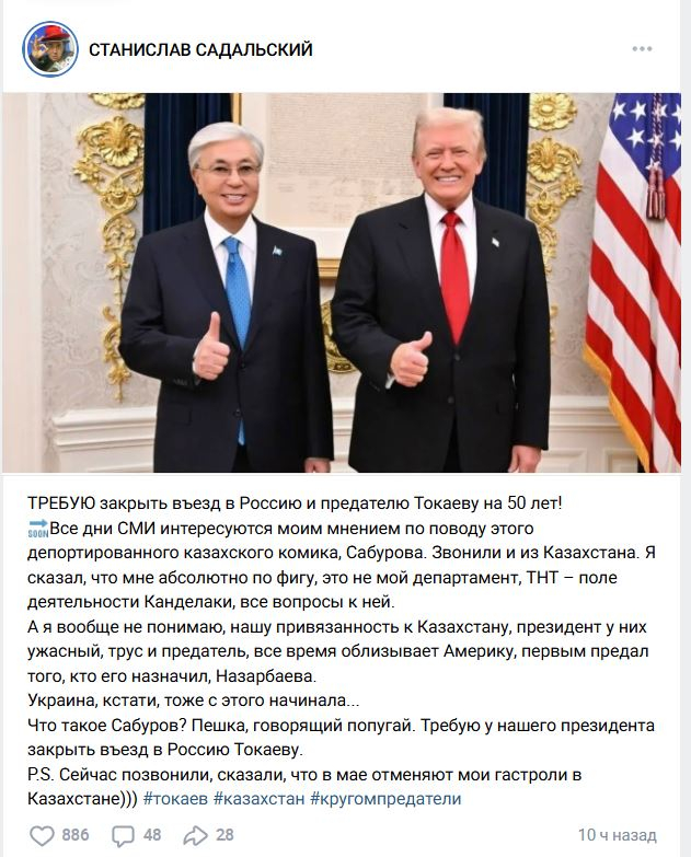 «ТРЕБУЮ закрыть въезд в Россию и предателю Токаеву на 50 лет! Все дни СМИ интересуются моим мнением по поводу этого депортированного казахского комика Сабурова. Звонили и из Казахстана. Я сказал, что мне абсолютно пофиг», – написал Садальский.