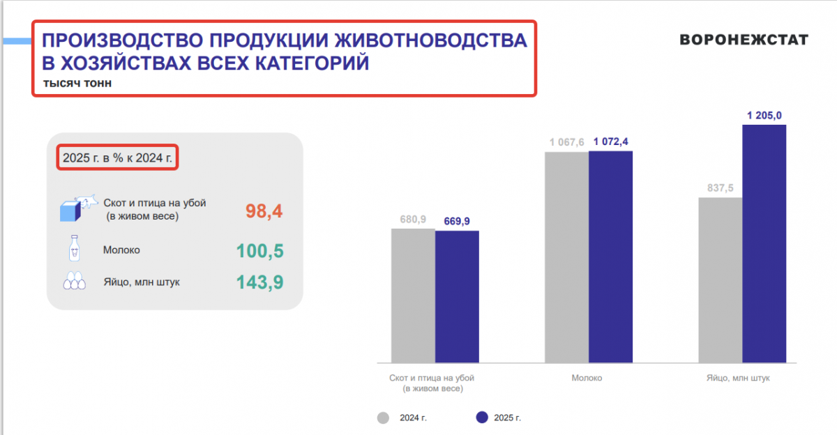В частности, Воронежстат отмечает в январе по пищевым продуктам: рост производства свинины на 49 процентов, мяса и субпродуктов на 37 процентов, мясных полуфабрикатов на 45 процентов. Но при этом по итогам 2025 года в регионе на 20 тысяч голов (или на 5 процентов) сократилось количество крупного рогатого скота, число свиней осталось почти на уровне 2024 года, или чуть более 2 млн голов, зато отмечен рост поголовья птицы, на 12 процентов, почти до 13 млн. Так что январское увеличение выпуска различной мясной продукции выглядит несколько странным на фоне снижения продукции животноводства (в хозяйствах всех категорий) в целом за 2025 год – на 1,6 процента. Скорее всего, местные переработчики получили немало сырья из других регионов и тем самым показали рост производства мясной продукции.