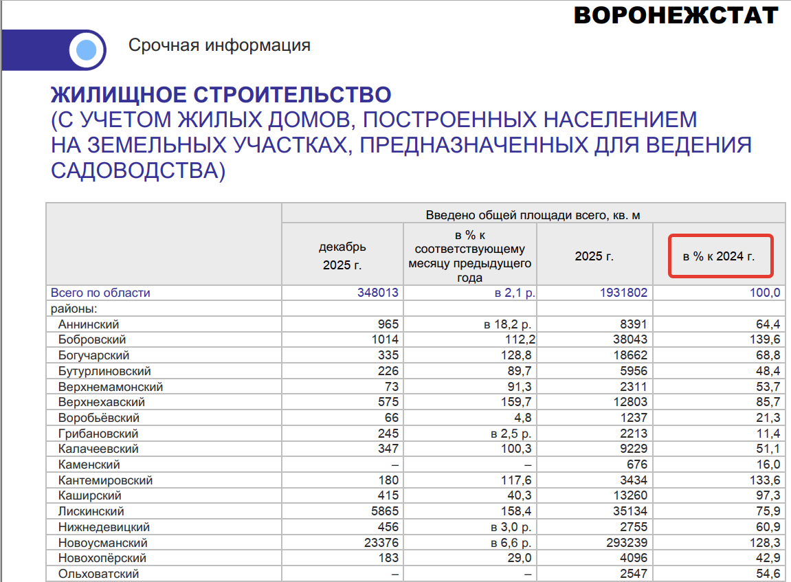 Только в 7 из 34 муниципальных образований Воронежской области по итогам 2025 года был зафиксирован рост объемов жилищного строительства. Причем в ряде районов стройка вообще «замёрзла»: в некоторых муниципалитетах объемы ввода жилья составили от 8,4 процента до 11 – 16 процентов от уровня предыдущего, 2024 года. То есть падение показателя на 70 - 90 процентов! С учетом того, что в статистике учитываются дома, построенные населением на земельных участках, предназначенных для ведения садоводства, то в ряде административных территорий вообще могло не вестись жилищное строительство. Либо собственники дач, построенных ее в 80 - 90 годы, переводили свои строения в статус "жилого дома" и тем самым улучшали статистику.