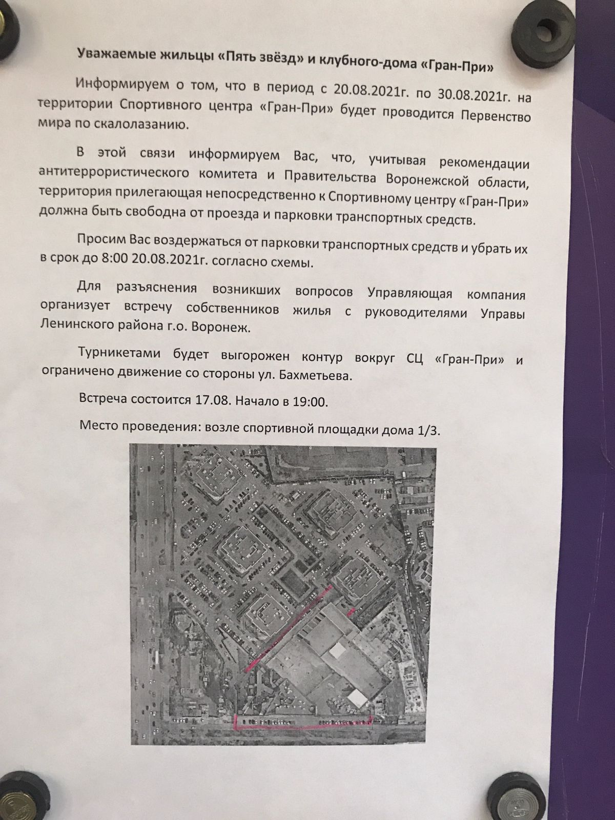 В редакцию «Блокнот Воронеж» обратились собственники квартир в ЖК «Пять звезд», что расположен на улице Ворошилова. Они рассказали, что очень скоро столкнуться с неудобствами по причине проведения в столице Черноземья Первенства мира по скалолазанию. Соревнования пройдут в соседнем от «Пяти звезд» спорткомплексе «Гран-При». Состязания должны быть масштабными и зрелищными. Вот только из-за них жители ЖК «Пять звезд» будут терпеть неудобства.