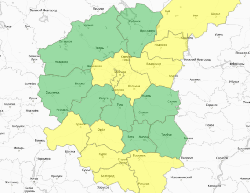 В целом в Центральной России сейчас установилась хорошая погода – в зеленом поясе помимо Липецка и Тамбова сейчас Рязань, Тула, Калуга, Смоленск, Тверь и Ярославль. В оранжевых и красных зонах нет никого.