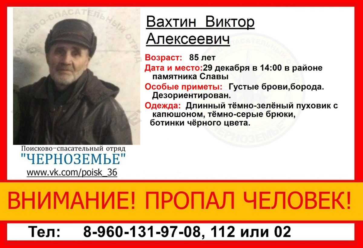 85-летний Виктор Алексеевич Вахтин пропал 29 декабря в Коминтерновском районе Воронежа. Его видели в квартале, ограниченном Московским проспектом, улицами Шишкова и Хользунова.