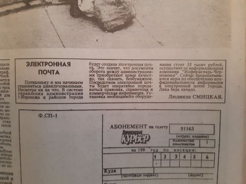 - Потихоньку мы начинаем становиться цивилизованными. Несмотря ни на что. В системе управления администрации г. Воронежа и районов города будет создана электронная почта. Это значит, что документы оборота между администрациями приобретают новое качество, так сказать, безбумажное. Посредством электронной почты будет оперативно передаваться правовая, справочная, коммерческая информация. Установка необходимого оборудования стоит 35 тысяч рублей, осуществит ее информационная компания «Информсвязь-Черноземье». Сейчас прорабатываются меры по обеспечению конфиденциальности информации в электронной почте города. Лиха беда начало, - писала ровно 28 лет назад журналистка «Воронежского курьера» Людмила Смицкая.